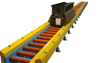 This system consists of a load station, runs of straight conveyor, 90 & 180 degree rollovers, turntables, gates, and a main control panel for each zone. An operator control station with pushbuttons and indicator beacons is located at each station. These custom designed and fabricated components are made with structural steel channel, steel platens, heavy duty rollers, heavy gage guards with guide wheels and stainless steel wear strips and heavy duty adjustable feet. The control system consists of powerful and flexible PLC's that utilize distributed processing as well as digital I/O modules and communication modules. Touchscreen HMI's, heavy duty DC power supplies, managed Ethernet switches, variable frequency drives utilizing DeviceNet communication, programmable laser safety scanners, photoeyes and proximity sensors were also used. Additionally, the customer supplied PC's, monitors and keyboards that were integrated into the system.