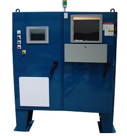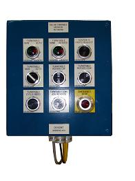 The control logic and components are provided through the main control panel.  A Beacon stack is mounted to the top of the enclosure to alert the operators of system faults and system mode status.  An operator interface HMI terminal and programming shelf is mounted to the front of the enclosure.  An Ethernet programming port and computer power outlet is also mounted to side of the control panel.