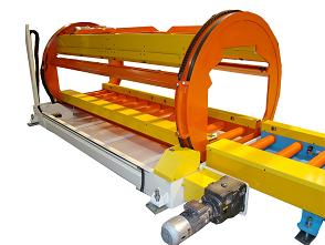 The Block Rollover consists of a fabricated steel drum inside a steel base structure frame.  The rollover drum is cut-out on each end to match the load profile.  The rollover rotates 180 degrees using chains powered by an electric brake motor controlled by a variable frequency drive.  The rollover drum has a top and bottom level of reversing chain driven roller conveyors powered by electric brake motors.  The powered rollers have a polyurethane coating to eliminate slipping of the load.  To guide the load as it transfers in and out of the rollover, gravity steel wheels are installed on each inner side of the rollover drum.  Photo eyes control the advancement of the load as well as monitoring the ends of the Rollover for obstructions.   A Safety Fence surrounds the Block Rollover to protect operators and personnel.