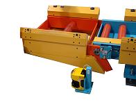The Load Station consists of a fabricated steel base frame with chain driven powered steel rollers.  A brake motor, controlled by a variable frequency drive, controls the powered chain driven rollers.  The steel rollers have a molded polyurethane coating to protect the load.  Stainless steel set-down guides are attached to each side of the conveyor to assist the operators when loading.  A steel drip pan is bolted to the conveyor frame under the rollers to catch any dripping fluids from the load.   An Operator control station is provided for automatic and manual control.  Proximity sensors control the positioning and the advancement of load as well as determine the load size.