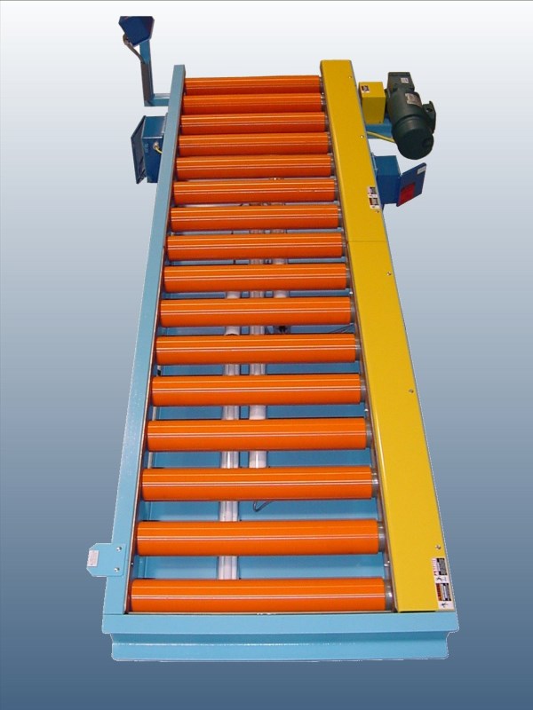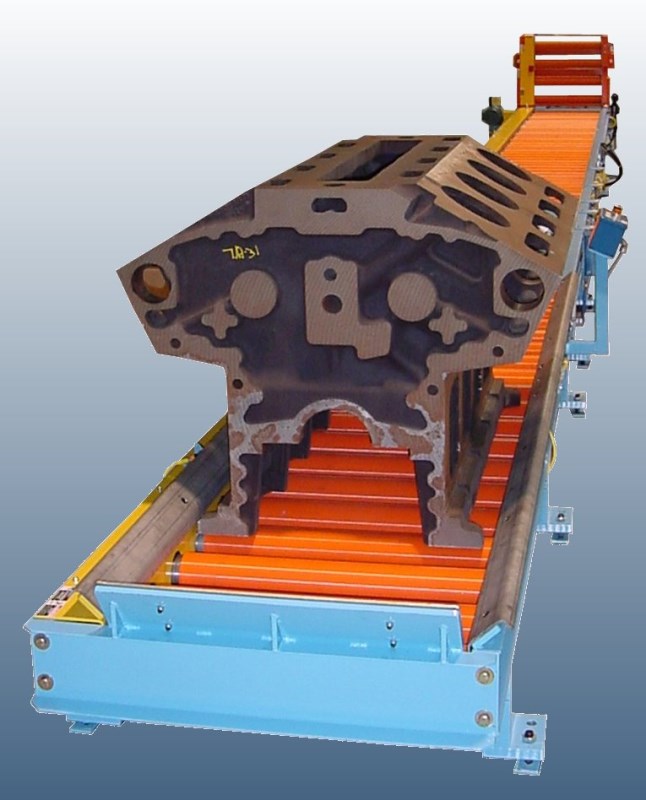The block conveyor is broken down into five separate sections; the load conveyor, the robot conveyor, the robot unload conveyor, the press conveyor, and the press unload conveyor. The block conveyors consist of fabricated steel frames with polyurethane coated chain driven rollers powered by electric motors.  The load conveyor contains bolt on steel set-down guides to assist the operators when placing a block on the conveyor.  The robot conveyor contains a brake system that engages to keep the rollers from moving while the robot inserts parts into the block.  A pneumatic cylinder actuated gate, with gravity rollers, is at the end of the robot unload conveyor.  The gate allows operators an access path around the press/leak test machine.  The press/leak test machine surrounds the press conveyor.  The press conveyor raises and lowers with air bags.  Also the press conveyor rollers are controlled by a variable frequency drive.  The press unload conveyor contains fluorescent lights underneath the rollers to assist the operators in inspection of the engine block.
