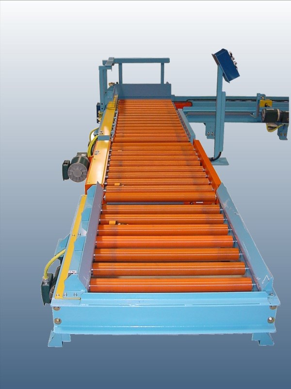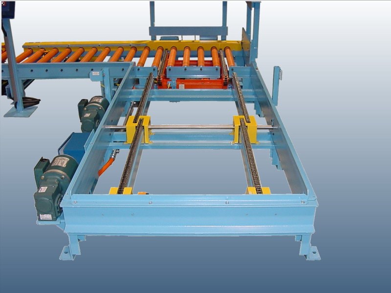 The pallet conveyor is broken down into four separate sections; the pallet input conveyor, the lift/turn station, the robot conveyor, and the exit conveyors.  The pallet input conveyor and robot conveyor consist of fabricated steel frames with polyurethane coated chain driven rollers powered by electric motors.  The input conveyor contains bolt on steel set-down guides.  The robot conveyor contains a 90 degree chain transfer device that raises and lowers.  The chains are powered by an electric motor.  The operator lift/turn station is a hydraulic lift with a powered chain driven roller conveyor turntable deck.  The turntable rotates 180 degrees to allow operators access to each side of the pallet.  A pneumatic cylinder controls the release of the turntable detent.  The exit conveyors contain chains that are powered by electric motors and guided by UHMW channels.