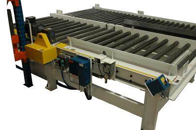 The load station conveyor consists of two zones.  Each zone contains ten (10) electrically powered chain driven rollers.  A pneumatic clutch/brake controls the actuation of each zone of rollers.  Steel set-down guides are bolted to the load station conveyor frame to assist the fork truck operator when loading a pallet.  An emergency stop pushbutton is also located at the end of the load station conveyor. The unload station conveyor contains (30) gravity hex spring retained rollers and a bolt on steel end plate. Photo-eyes are installed on each zone of the conveyors to detect pallets.