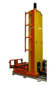 The stacker consists of a fabricated steel frame with a bolted on fabricated steel carriage assembly.  The stacker carriage assembly contains a telescoping chain transfer device powered by an electric brake motor.  The chain transfer is mounted onto rails and utilizes a pneumatic cylinder with flow controls to control motion.  The stacker motion and carriage motion is controlled by separate electric servo motors with brakes.  The stacker carriage utilizes a ball screw assembly to move it up and down on steel rails.  Urethane bumpers are installed on the base frame of the stacker assembly to protect the carriage in the event of an over-travel sensor failure.  A barcode scanner is mounted to the stacker carriage.