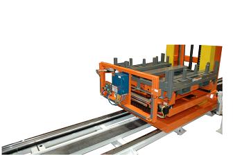 The machine load station assembly consists of a fabricated steel base frame containing two (2) fabricated steel pop-up conveyors.  The pop-up conveyors each contain eight (8) electrically powered chain driven rollers and four (4) pneumatic air bags with quick exhausts that control the raising and lowering of the conveyors.  A gravity roller is located at the entry to the conveyors to assist the pallets as they transfer to and from the stacker.  The cross transfer reversing conveyor contains chains that are powered by an electric variable frequency drive and guided on rails.