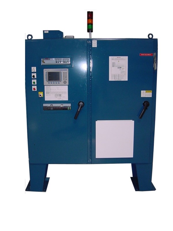 The control logic and components for the Storage Retrieval System are provided through the main control panel.  The HMI operator interface is mounted on the front of the Main Control Panel.  A key switch is located on the side of the panel.  The key switch provides a system override selection.  The key switch can be placed in three (3) separate positions; “Roll Mach”, “Both”, and “Pallet Conv”.
